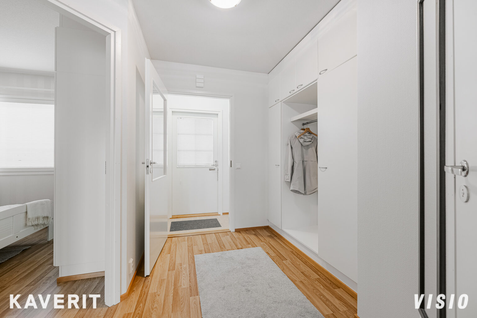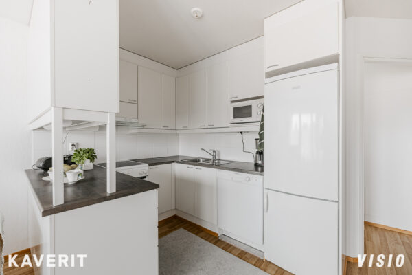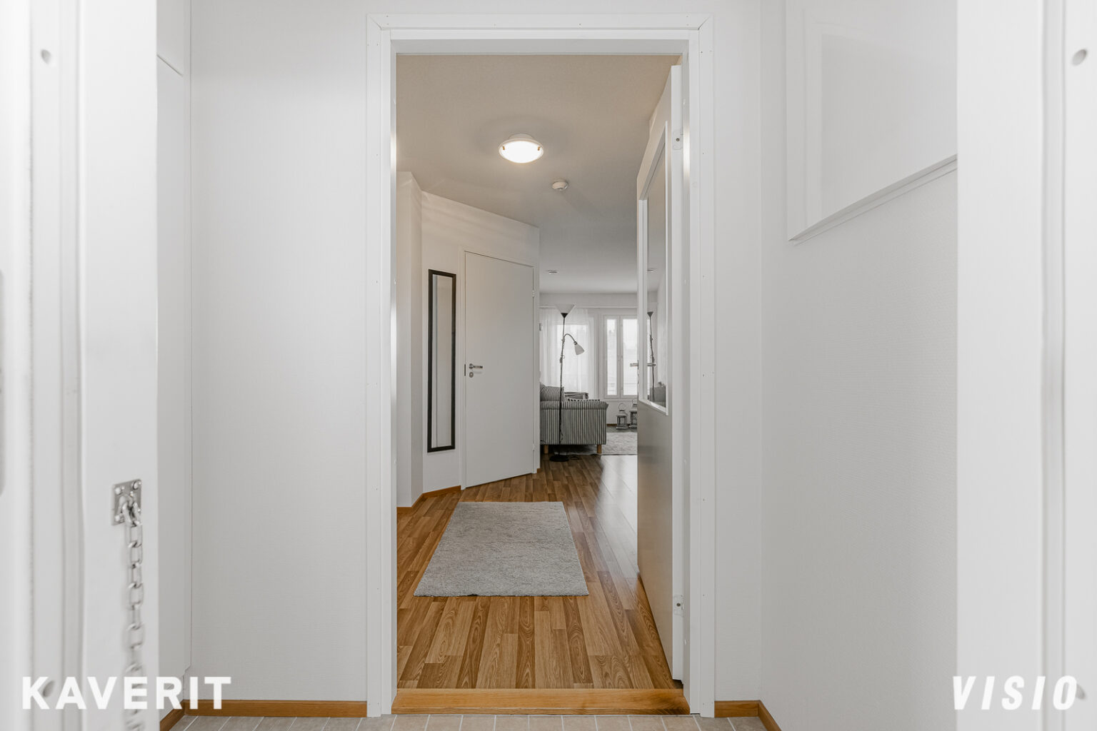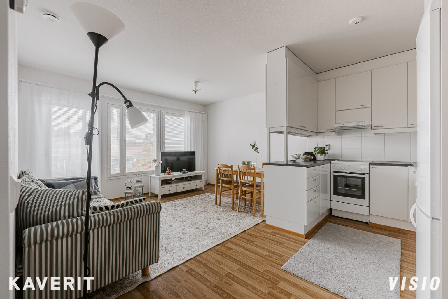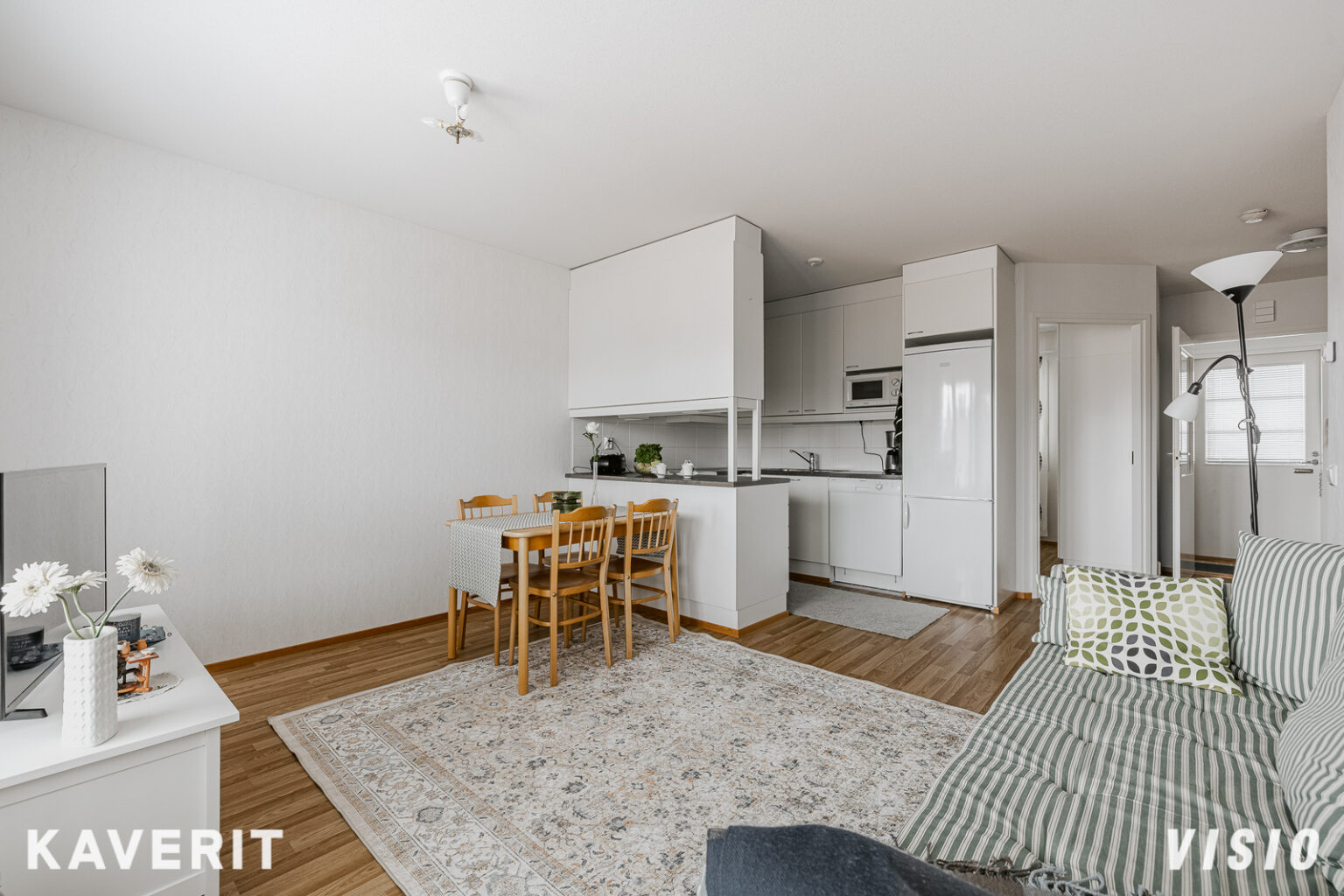 Asunnon vaaleat pintamateriaalit ja toimiva pohjaratkaisu luovat valoisan ja avaran kokonaisuuden. Toimivaksi suunnitellussa, modernin ilmeen omaavassa keittiössä on paljon kaappi- ja laskutilaa. Keittiö ja olohuone muodostavat yhtenäisen, viihtyisän oleskelutilan, josta on kulku etelään suuntautuvalle parvekkeelle. Ajattoman tyylikkäässä kylpyhuoneessa wc, paikka pesutornille sekä ikkunallinen sauna. Asunnolle kuuluu autokatospaikka sekä autokatosrakennuksen yhteydessä sijaitseva
