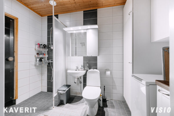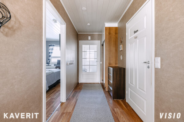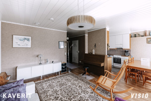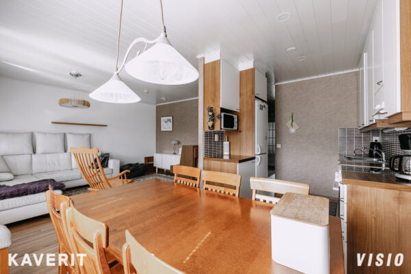 Miellyttävä pohjaratkaisu, jossa keittiö ja olohuone yhteydessä toisiinsa, mahdollistaen molempiin mukavasti tilaa. Tilojen väliin jää paikka suuremmallekin ruokailuryhmälle. Toimivaksi suunnitellussa keittiössä hyvin lasku- ja kaappitilaa. Olohuoneesta kulku lounaaseen suuntautuvalle terassille sekä omaa rauhaa tarjoavalle takapihalle. Makuuhuoneessa kiinteät kaapistot koko seinustan leveydeltä ja suuri koko mahdollistaa vaikkapa työpisteen sijoittamiselle samaan tilaan.