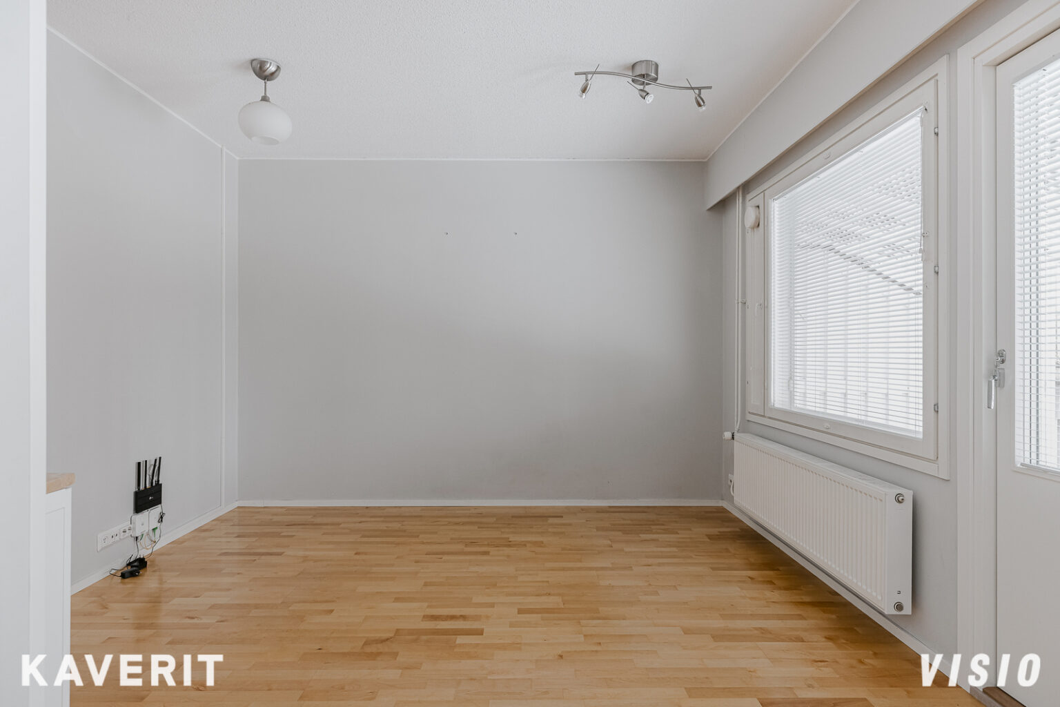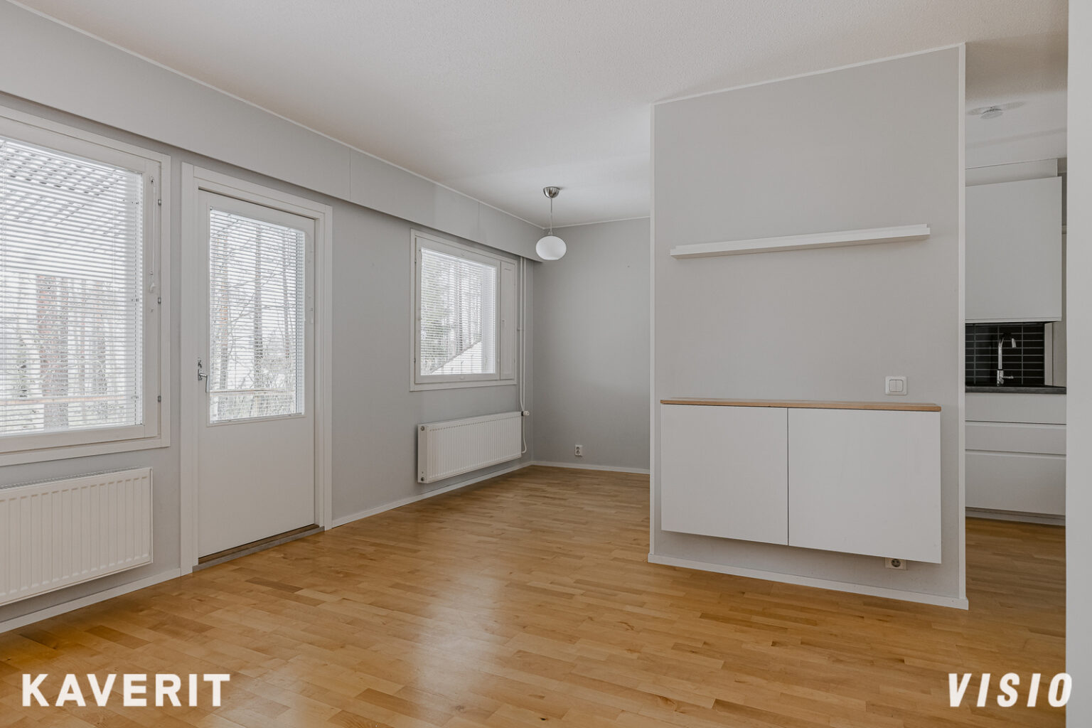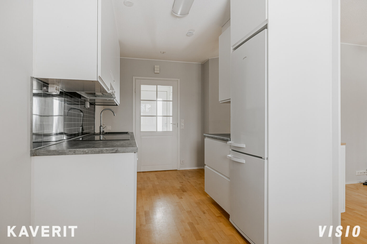 Erinomainen pohjaratkaisu, jossa avara ja yhtenäinen keittiö-/olohuonetila. Vuonna 2016 ajattoman tyylikkäin kalustein remontoidussa keittiössä kaapistot kahdella seinustalla sekä paikka suuremmallekin ruokailuryhmälle. Olohuoneessa runsaasti tilaa erilaisille sisustusratkaisuille sekä kulku lähivirkistysalueeseen rajoittuvalle suojaisalle takapihalle. Aidatulla takapihalla suuri, koko huoneiston levyinen osittain katettu terassi. Järkevän kokoinen makuuhuone, jossa kiinteät kaapistot. Kylpyhuoneessa pesukone, ikkunallinen sauna sekä käytännöllinen vaatehuone lisäämässä asunnon säilytystilaa.