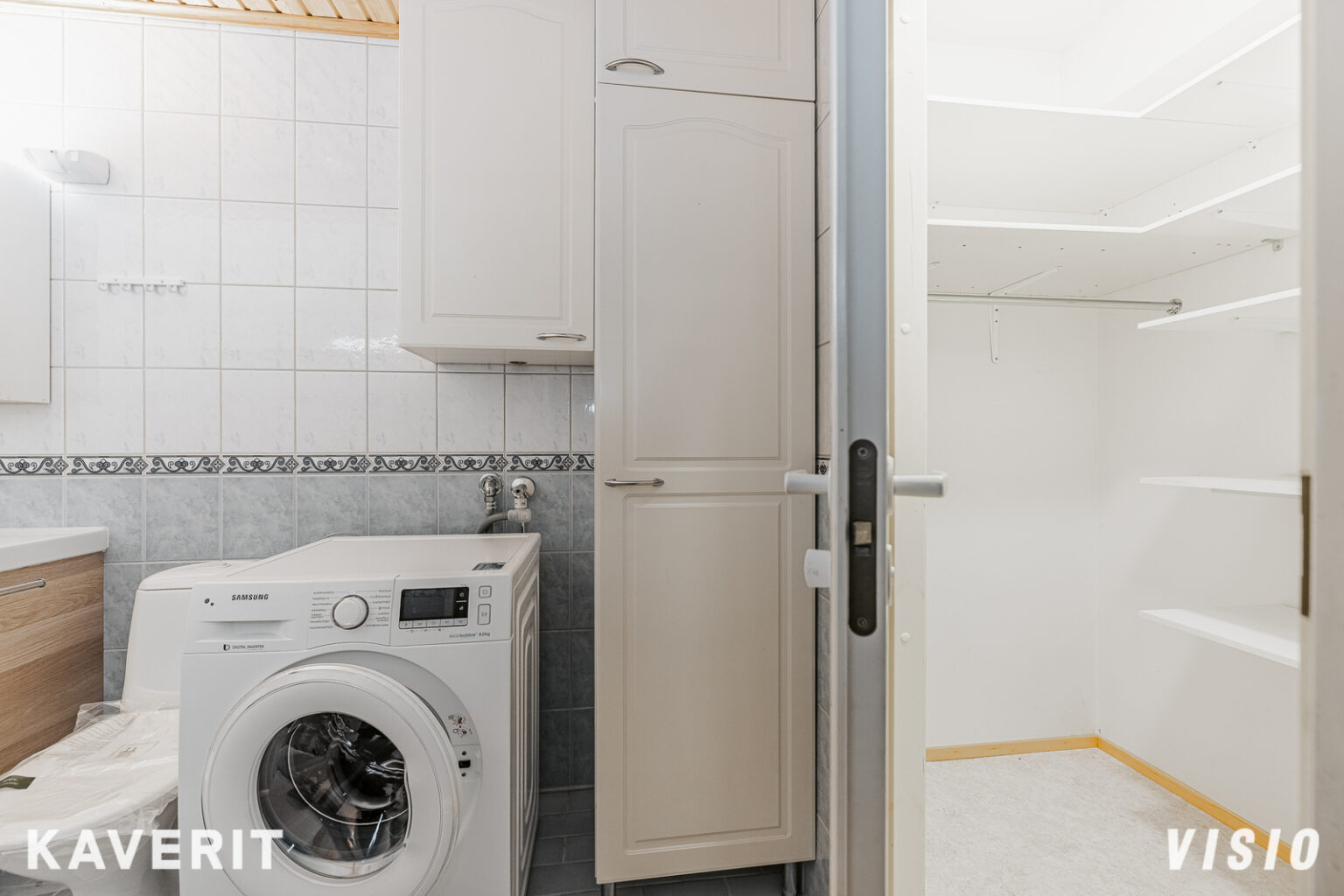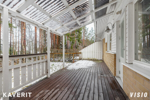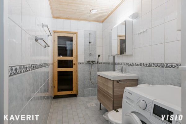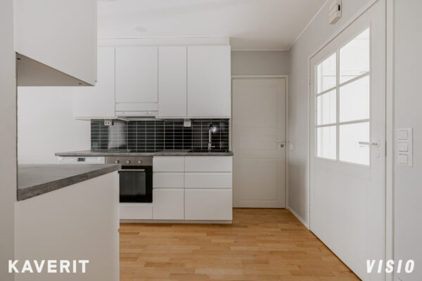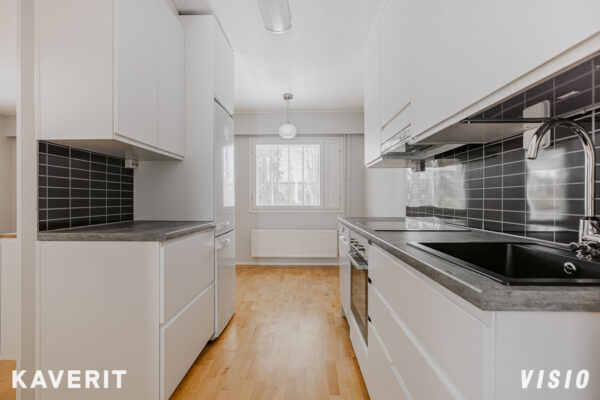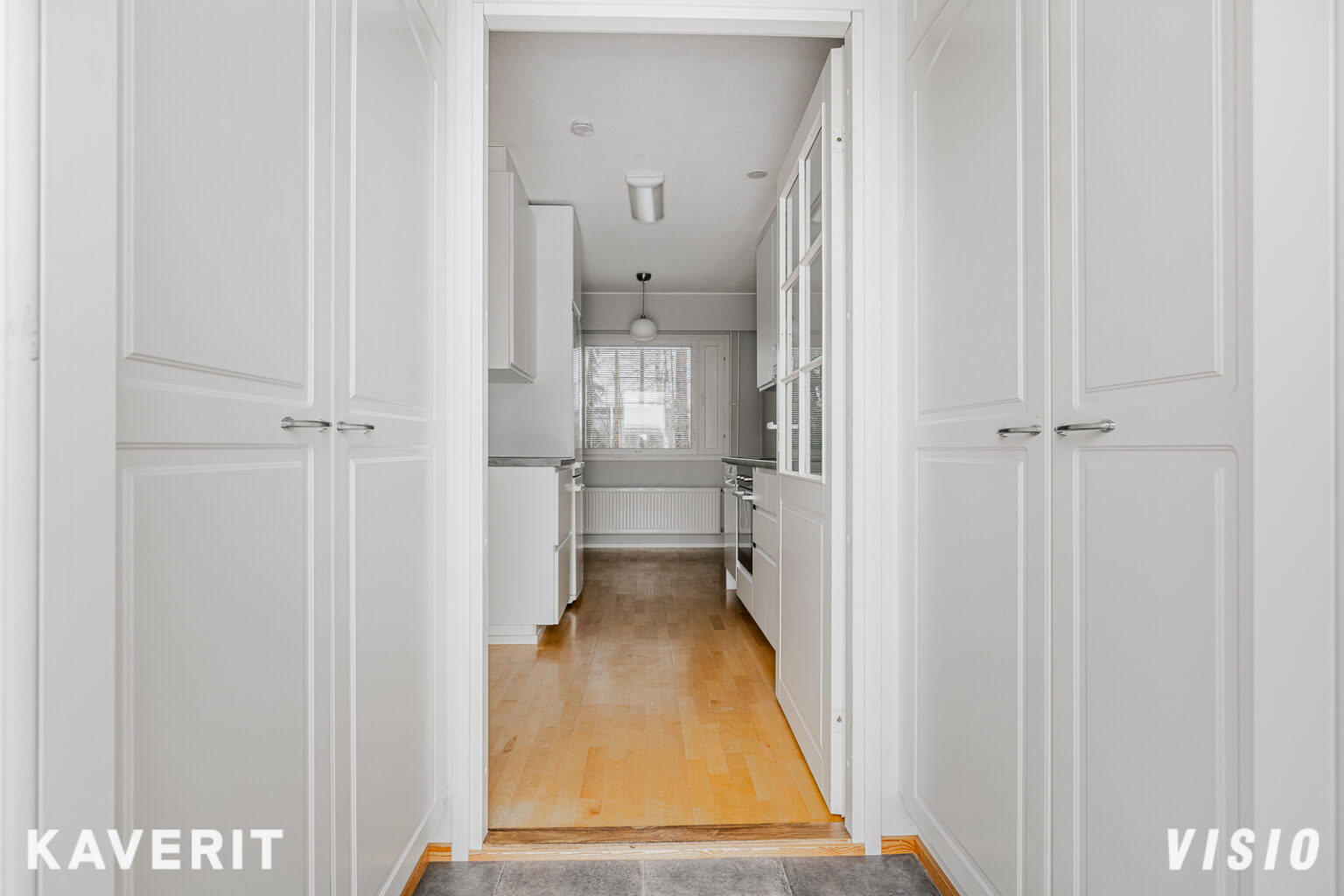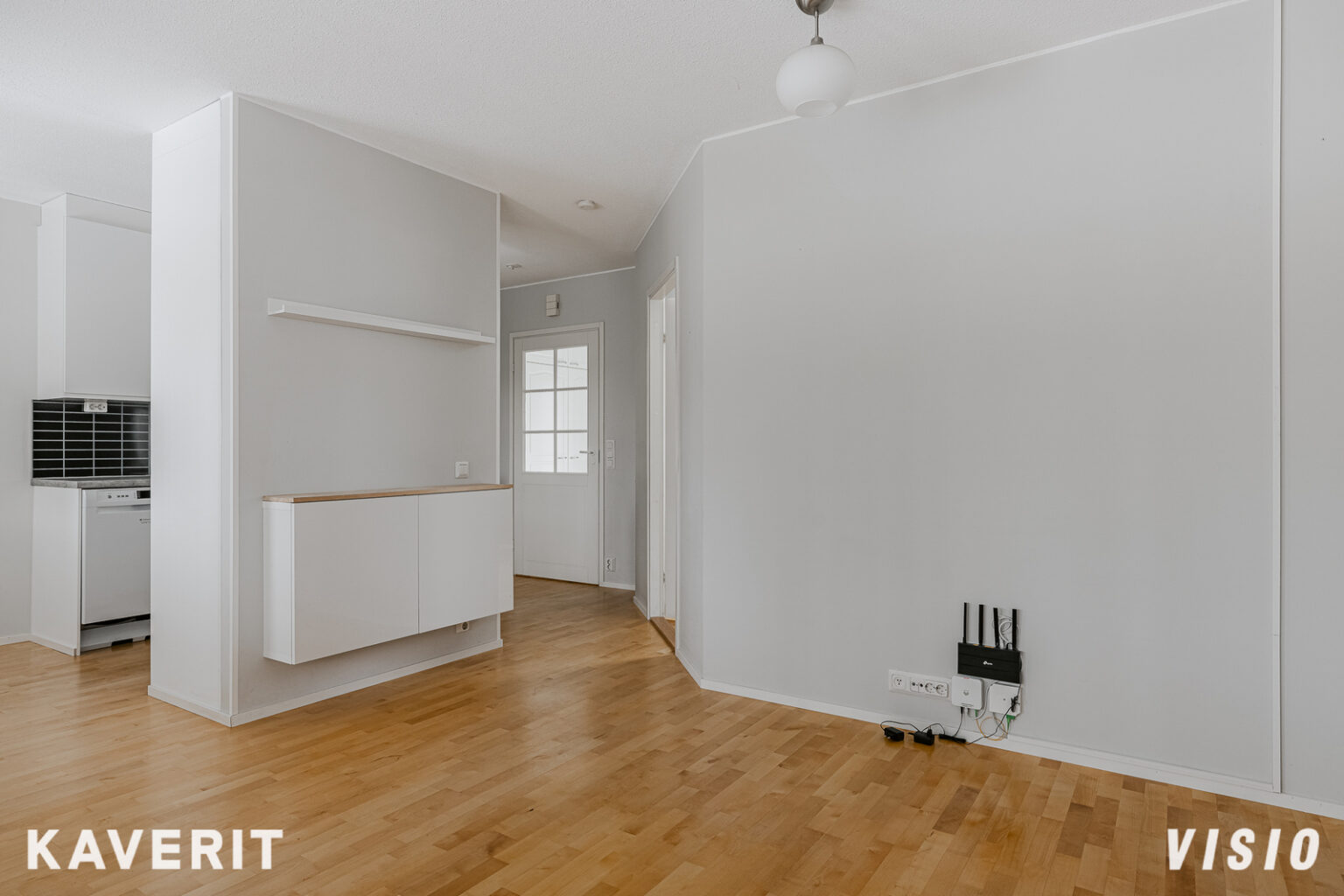 Erinomainen pohjaratkaisu, jossa avara ja yhtenäinen keittiö-/olohuonetila. Vuonna 2016 ajattoman tyylikkäin kalustein remontoidussa keittiössä kaapistot kahdella seinustalla sekä paikka suuremmallekin ruokailuryhmälle. Olohuoneessa runsaasti tilaa erilaisille sisustusratkaisuille sekä kulku lähivirkistysalueeseen rajoittuvalle suojaisalle takapihalle. Aidatulla takapihalla suuri, koko huoneiston levyinen osittain katettu terassi. Järkevän kokoinen makuuhuone, jossa kiinteät kaapistot. Kylpyhuoneessa pesukone, ikkunallinen sauna sekä käytännöllinen vaatehuone lisäämässä asunnon säilytystilaa.