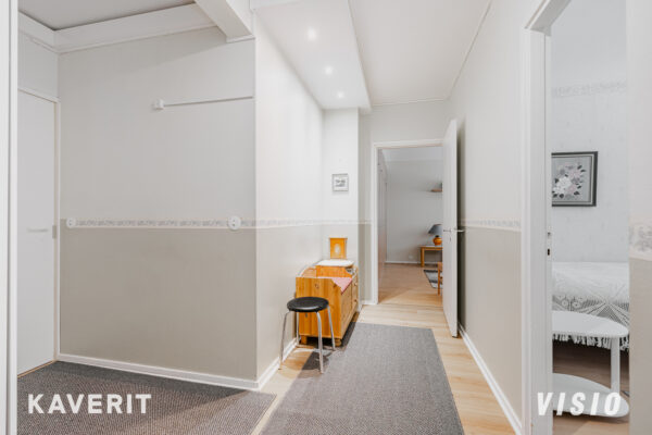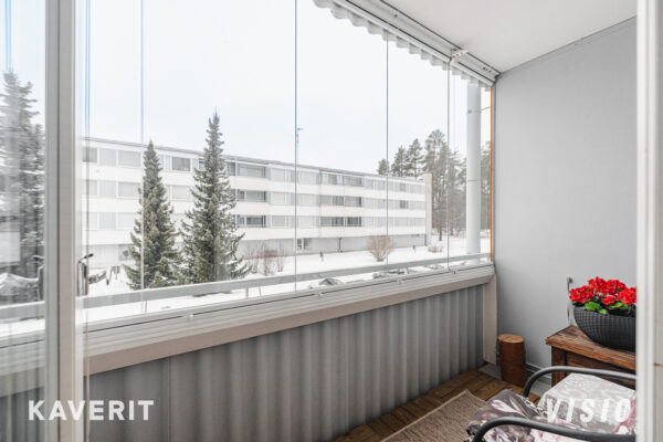 Asunnossa on toimiva pohjaratkaisu kahdella makuuhuoneella, sekä reilun kokoisella olohuoneella. Keittiössä säilytystilaa kahdella seinustalla sekä paikka ruokailuryhmälle. Olohuoneesta kulku asunnon länteen suuntautuvalle lasitetulle parvekkeelle, joka tarjoaa viihtyisää lisätilaa aikaisesta keväästä myöhälle syksyyn asti. Vuonna 2017 remontoidussa kylpyhuoneessa modernit laatoitukset, wc sekä pesukoneliitäntä. Yhtiön varustuksiin kuuluu muun muassa kaukolämpö, koneellinen poistoilmanvaihto sekä Lounean valokuituyhteys.