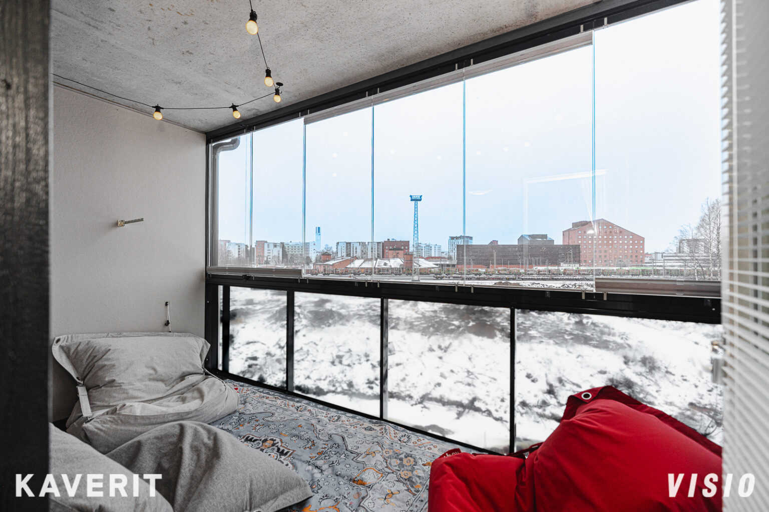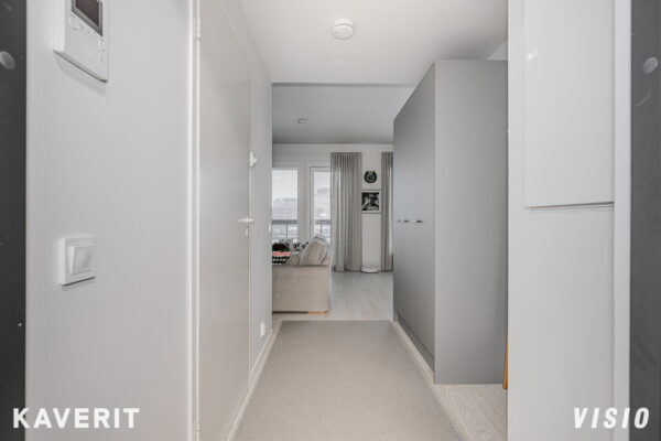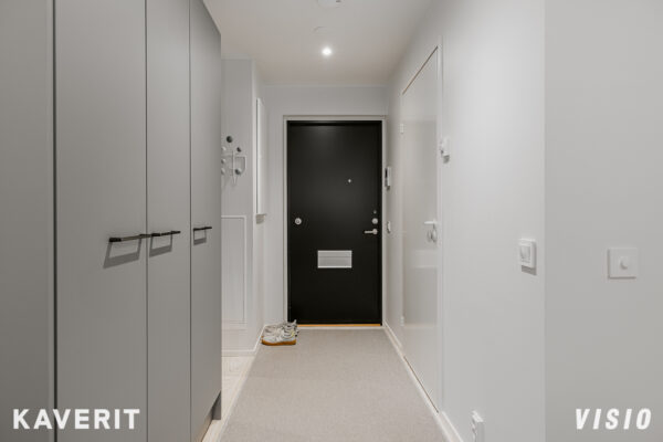 Tilojen kuvaus- Eteisessä novartin vaate+siivouskaappi, väri matta vaaleanharmaa. - Parvekkeella Riikku-merkin lasitukset ja Lumon merkin kaihtimet yläikkunoissa. Lattiassa musta terassimatto.
