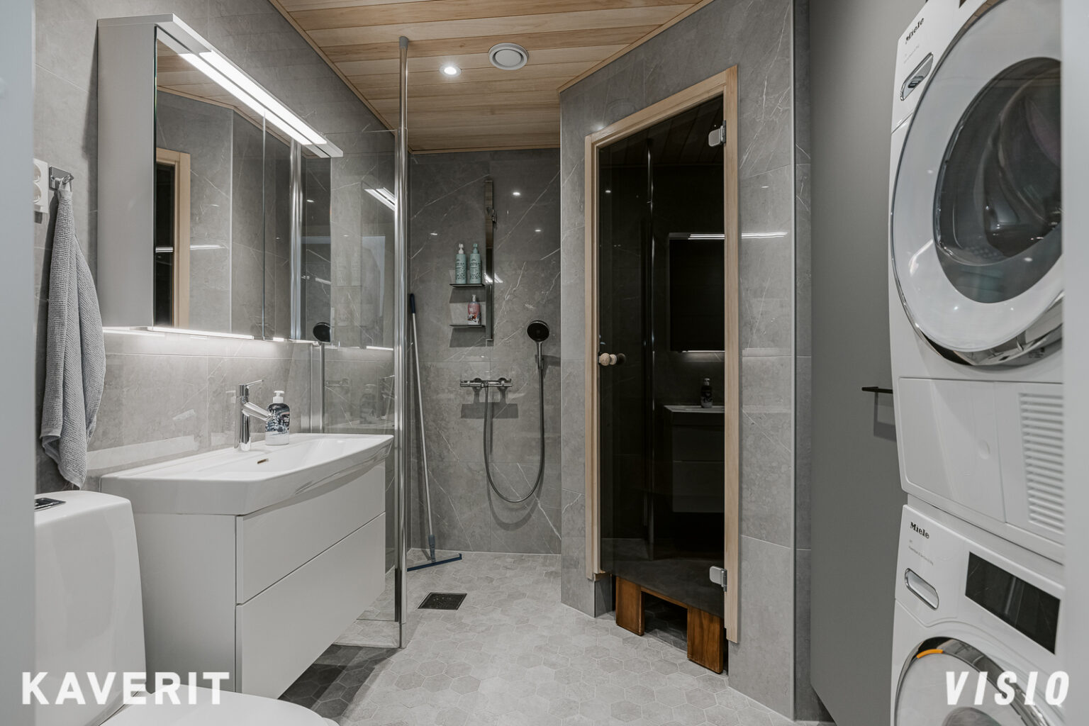 • Varusteet: suihkuseinä, pesukoneliitäntä, lattialämmitys, wc-istuin, suihku, peilikaappi