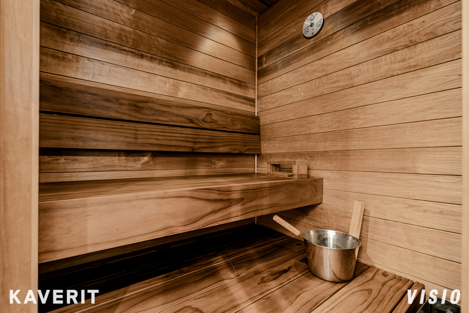 • - Seinät ja katto lämpökäsitelty haapa - Lauteet radiatamänty (puusepänliike ahokas) - Harvia the wall 4,5kw kiuas