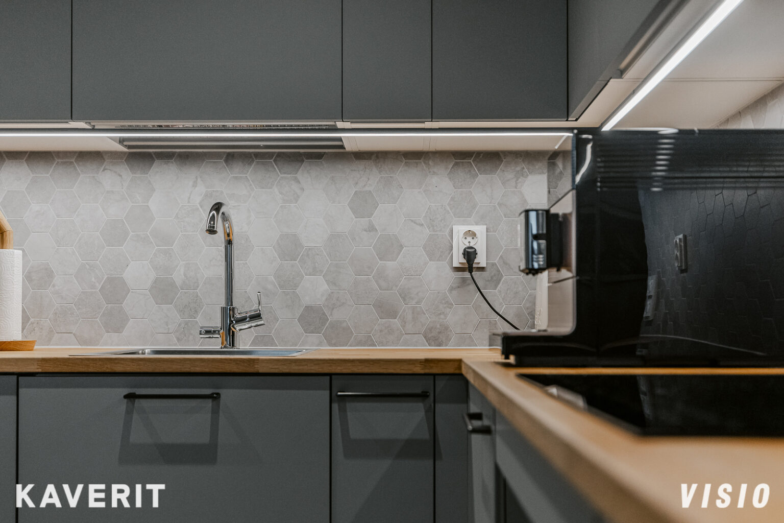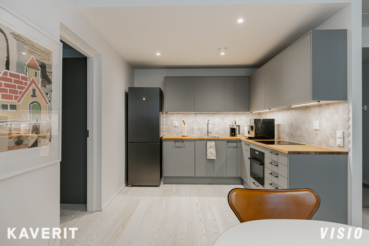 • - Novartin keittiö / Kaappien väri: Matta vaaleanharmaa / Öljytyt massiivipuu tammi-työtasot / Välitilassa 6-kulma laatta - Keittiössä ei ole erillistä mikroa vaan käytössä on yhdistelmäuuni (uuni+mikro) 45cm korkeana. Kalustetoimittajan mukaan uunikaappi on mahdollista muuttaa, että tilalle saa normaalin 60cm korkean uunin tai siemens merkiltä 60cm korkean yhdistelmäuunin. - Kodinkoneet: AEG apk+liesitaso+yhdistelmäuuni / Thermex liesituuletin aktiivihiilisuodattimella / Liebherr jääkaappi/pakastin