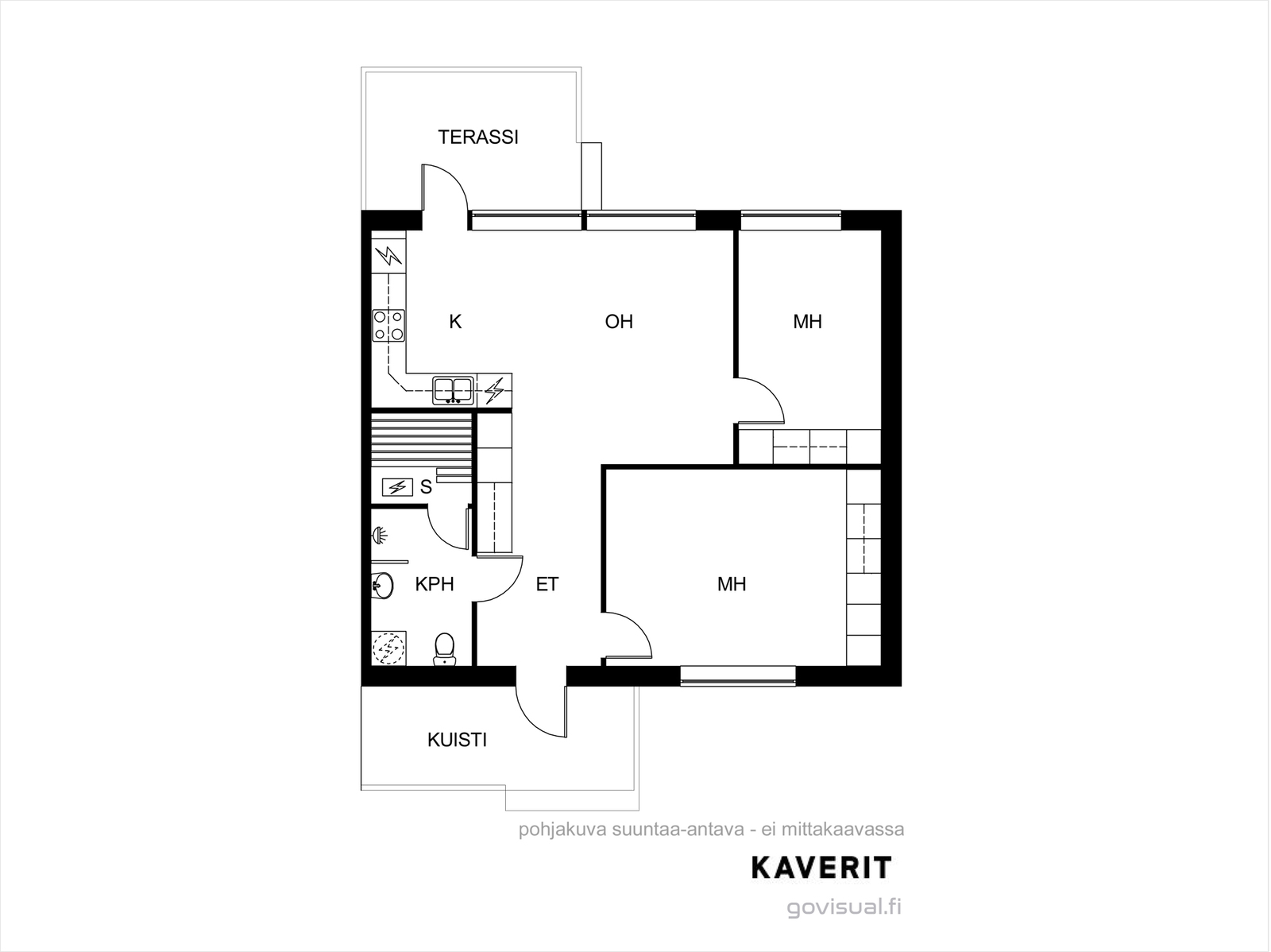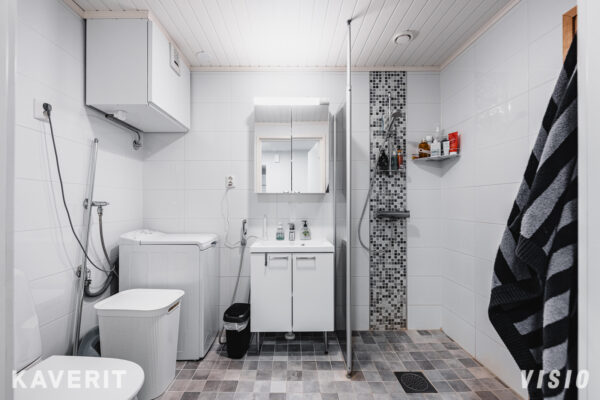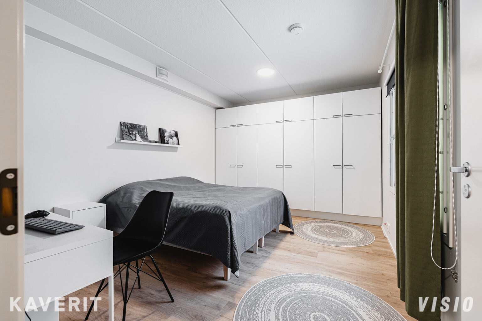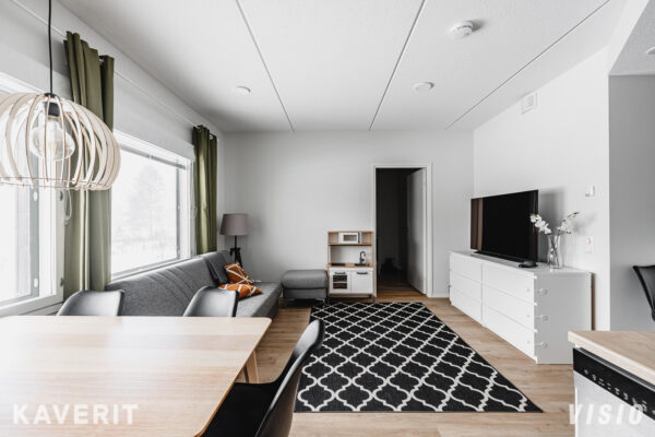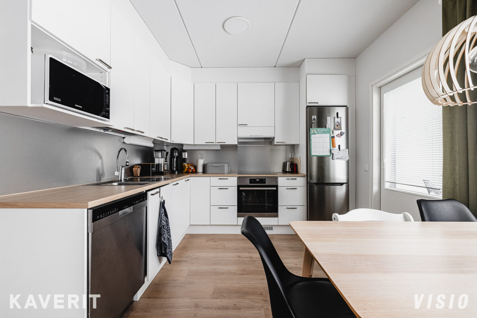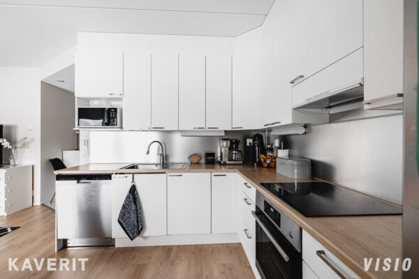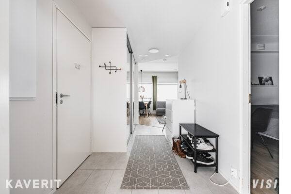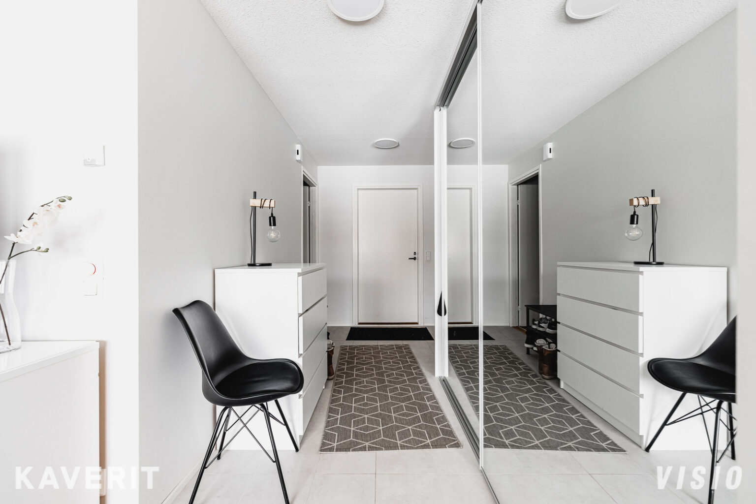 Huoneistossa korkeatasoinen moderni sisustus ja seesteiset materiaalivalinnat. Viihtyisä ja tyylikäs kokonaisuus, jossa huolellisesti suunniteltu pohjaratkaisu. Eteisessä suuret peililiukuovikaapistot ja harmaa laattalattia. Keittiö ja olohuone yhtenäistä avaraa tilaa, jonka länteen suuntautuvat suuret ikkunat tuovat runsaasti luonnonvaloa asuntoon. Olohuoneesta käynti katetulle terassille ja takapihalle. Järkevän kokoiset makuuhuoneet, joissa molemmissa reilusti säilytystilaa.